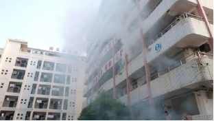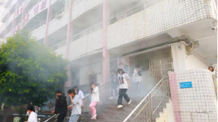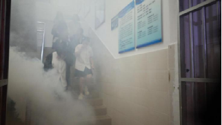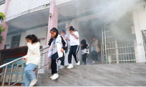 7:40警笛四起,二校区教学楼浓烟滚滚,正在上早读课的班主任迅速发动班干部配合组织学生有序撤离教室,并叮嘱每位学生用湿毛巾捂住口鼻,弯腰贴着右墙逃生,不到4分钟,教学楼里的学生全部安全有序地撤离了“事故”现场,集中在空旷、安全的安全区域。