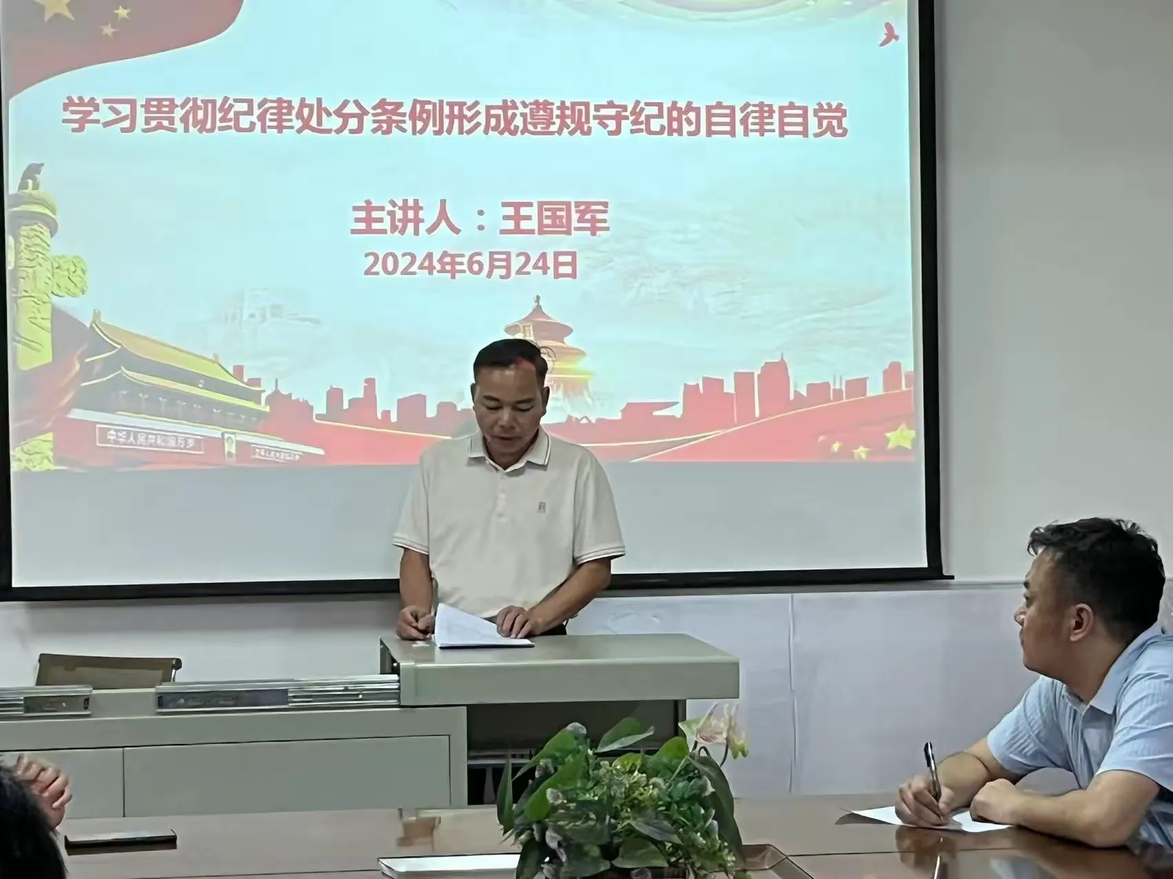 6月24日下午,第三党支部书记王国军讲《学习贯彻纪律处分条例形成遵规守纪的自律自觉》纪律党课。他强调要深化党纪认知,强化党性修养,践行党纪要求,不断深入学习、勇于实践,将党纪学习教育要求转化为推动工作的强大动力。