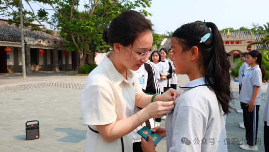出席活动领导老师为新团员代表颁发团员证和佩戴团徽。