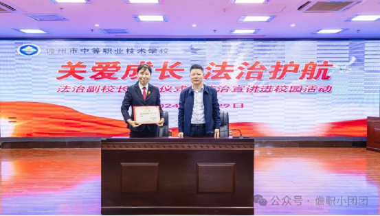 为进一步做好学校青少年法制宣传教育和校园及周边治安综合治理,使同学们知法、懂法、守法、用法,维护学校师生合法权益,创建和谐校园,平安校园,为同学们营造健康成长的良好氛围。2024年2月29日,儋州市中等职业技术学校举行法治副校长聘任仪式暨法治宣讲进校园活动。校党总支书记、校长吴鹏、副校长王亚明、儋州市法院高云出席本次活动。会议由校团委书记陈姝莹主持。