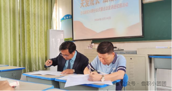 ? ? ?校党总支书记、校长吴鹏与法治副校长彭林签订协议并颁发聘书。